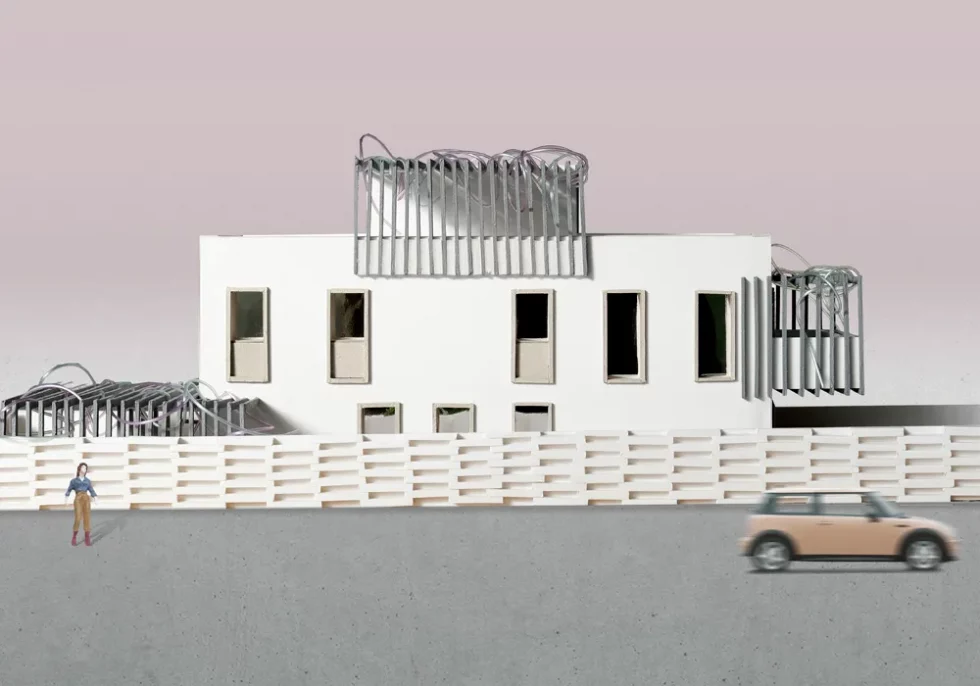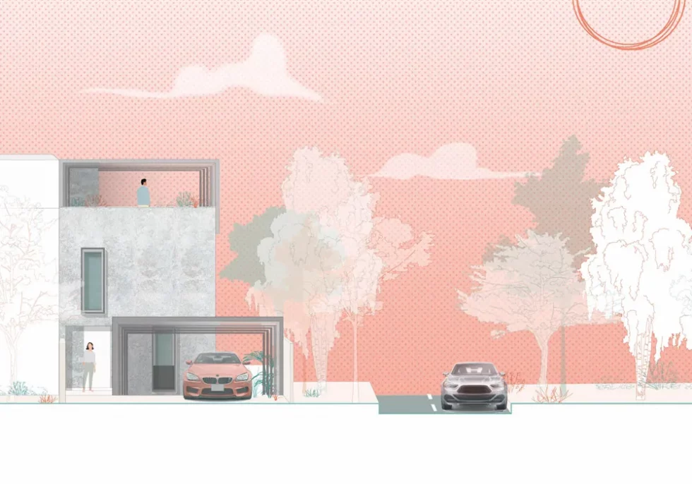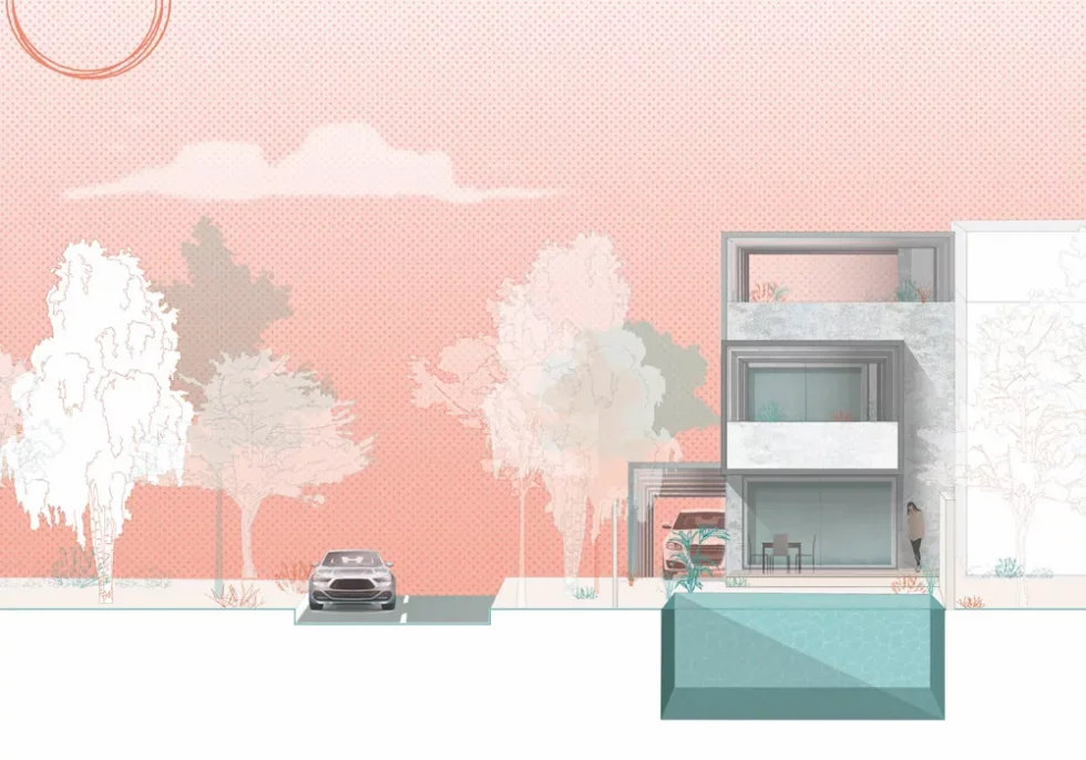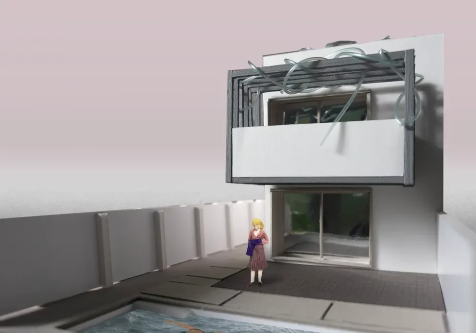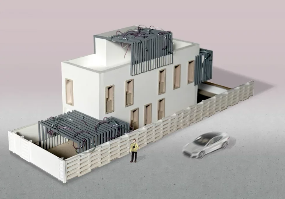 Some metallic pergolas designed to cast shadows on the house are actually prisms that play three-dimensionally with the solid white cousin of the house.