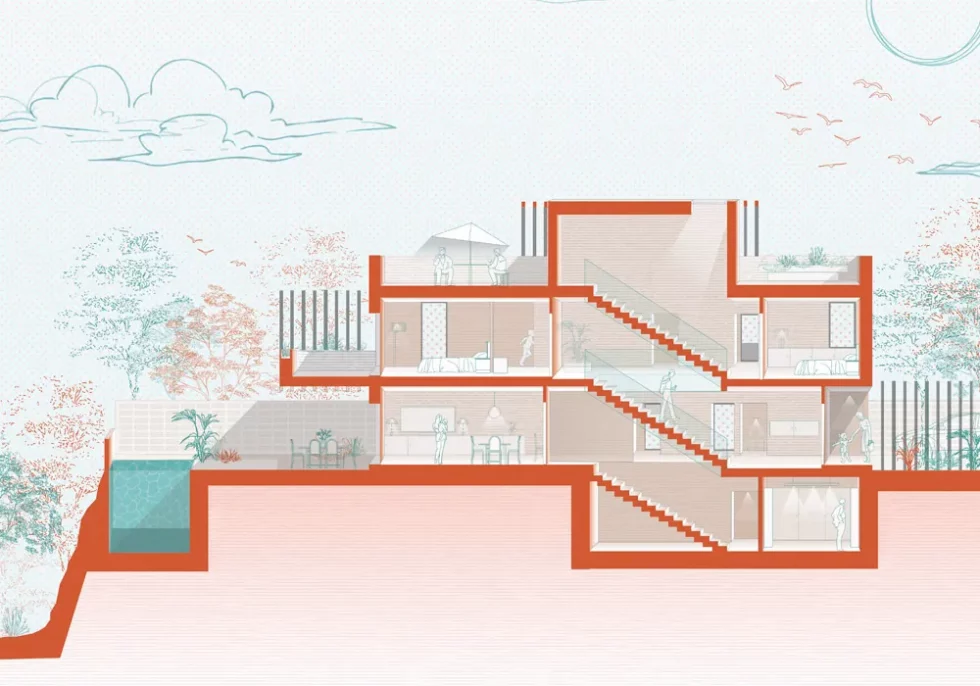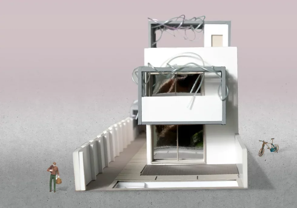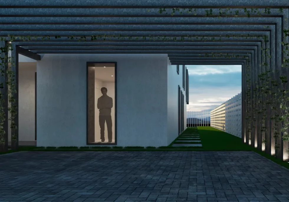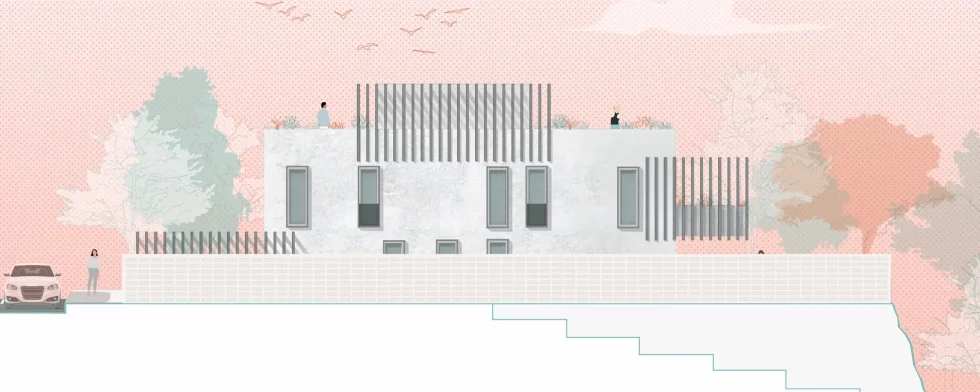 Three light prisms, the three pergolas, that play with a solid prism, the house.