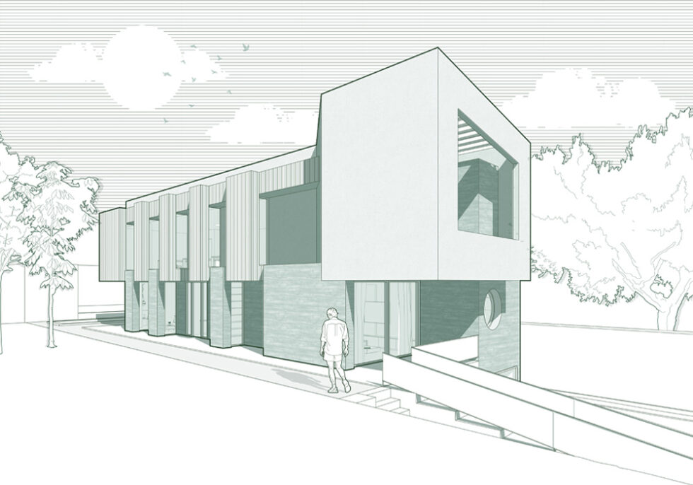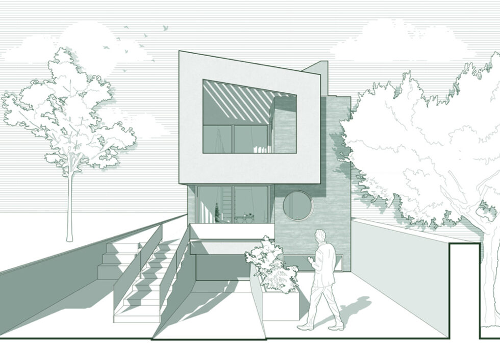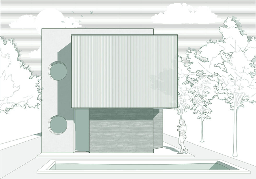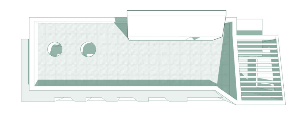 On the first floor is the art studio, occupying the entire floor of the house. It is flooded with light through the sawtooth windows of the facades and through skylights that pierce the building’s green roof. After a day of painting upstairs, you go to the ground floor and enjoy your family, your garden… Noise pollution is controlled inside the home, with cabinets and storage to muffle the noise from the circulation spaces in the bedrooms.
