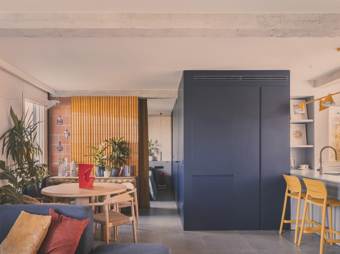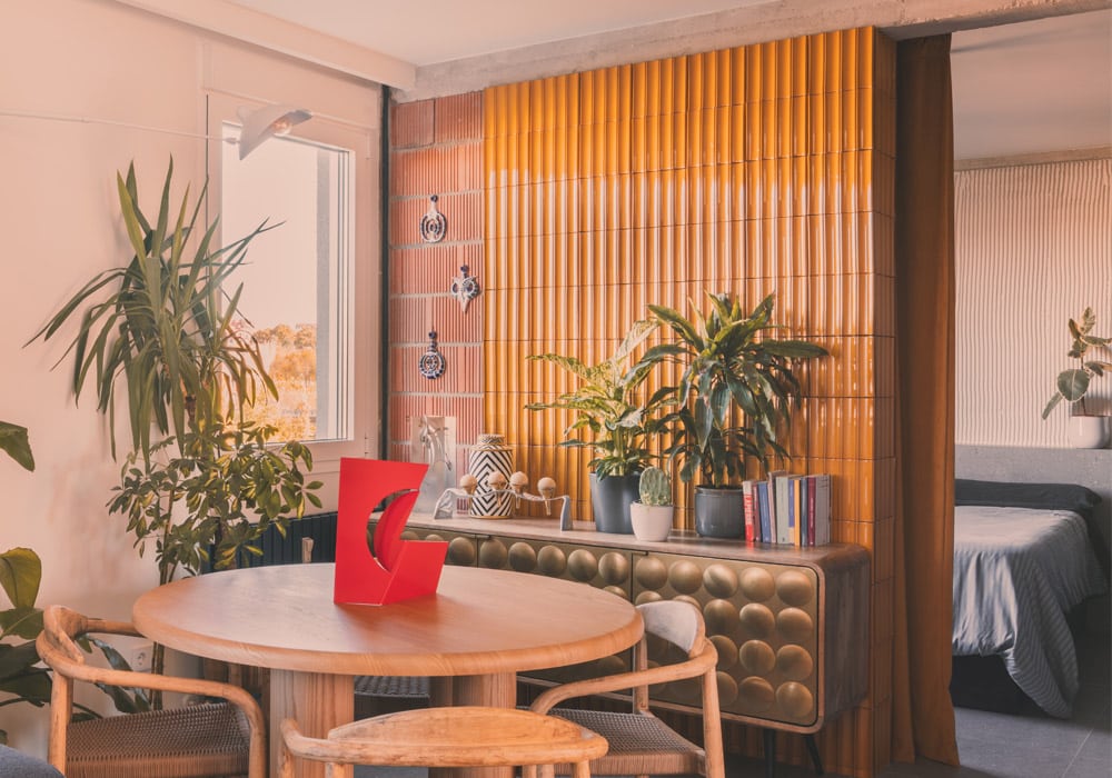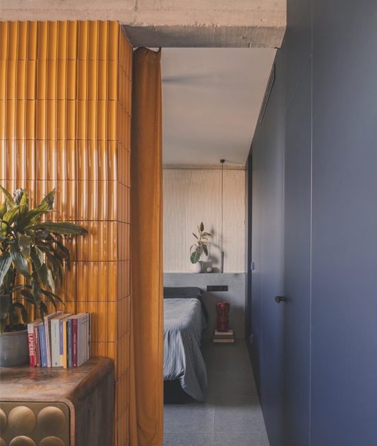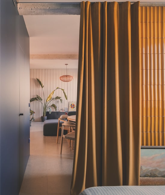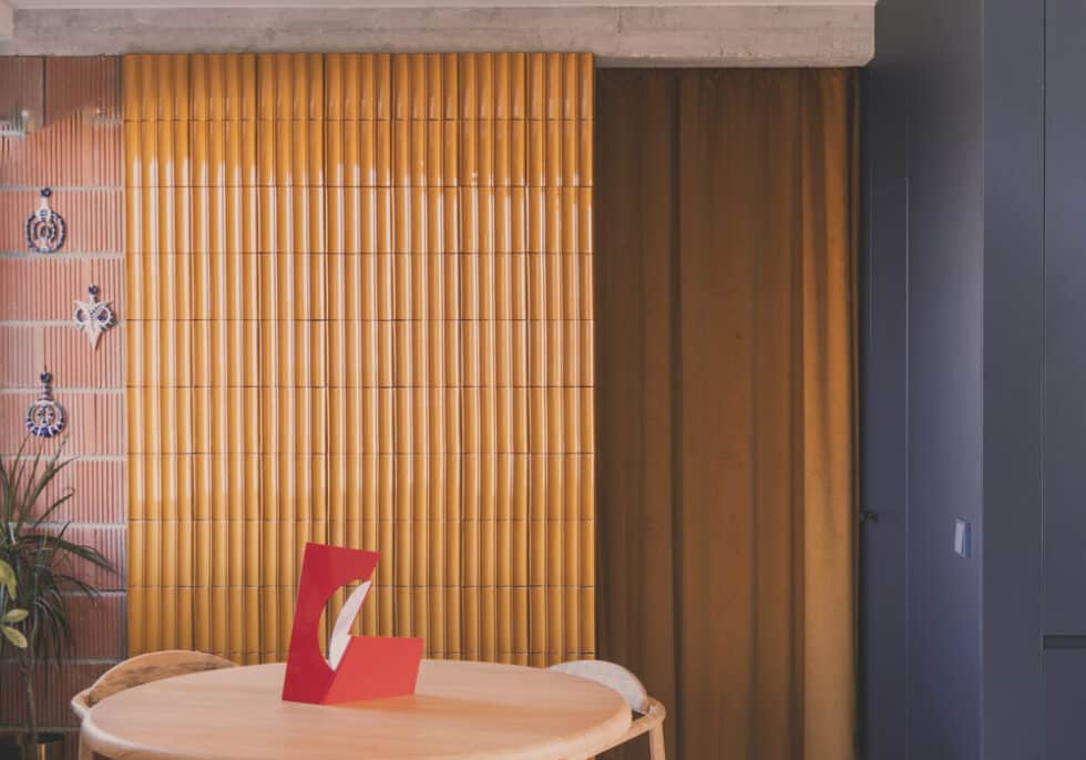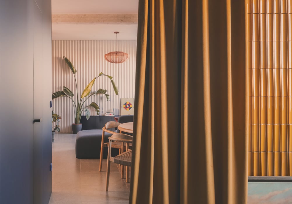 La cortina de terciopelo dorado que separa el salón del dormitorio da continuidad con sus pliegues a las ondas del alicatado de piezas amarillas que cubren el muro junto a ella. Justo enfrente se apoya un aparador con puertas color aceite. La lámpara arcilla dialoga con el armario color tierra, la lámpara amarilla con la encimera de la cocina azul celeste,…