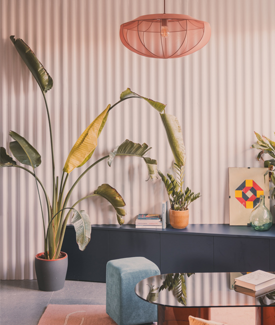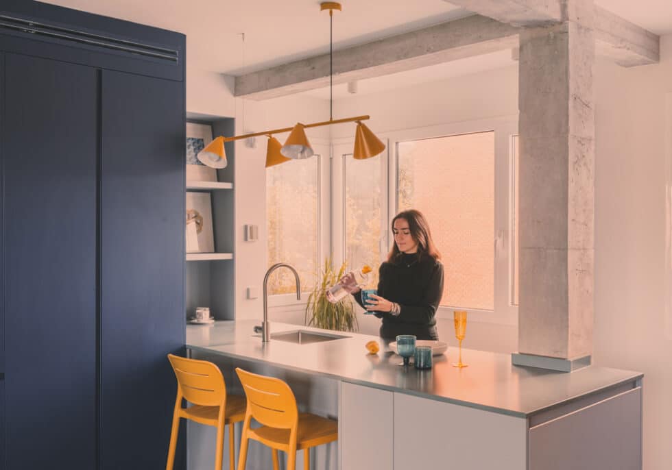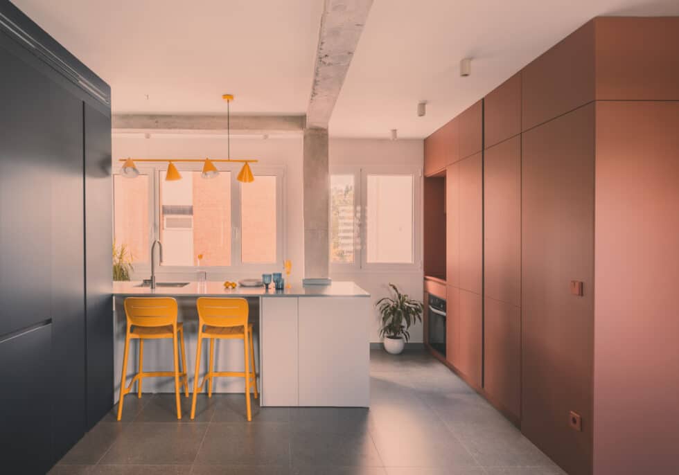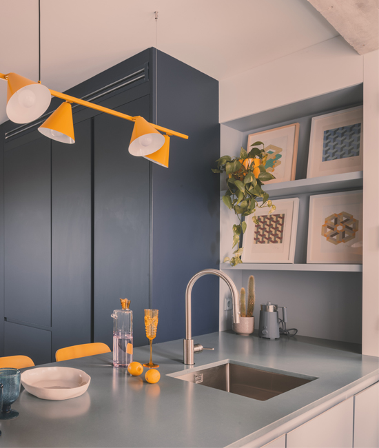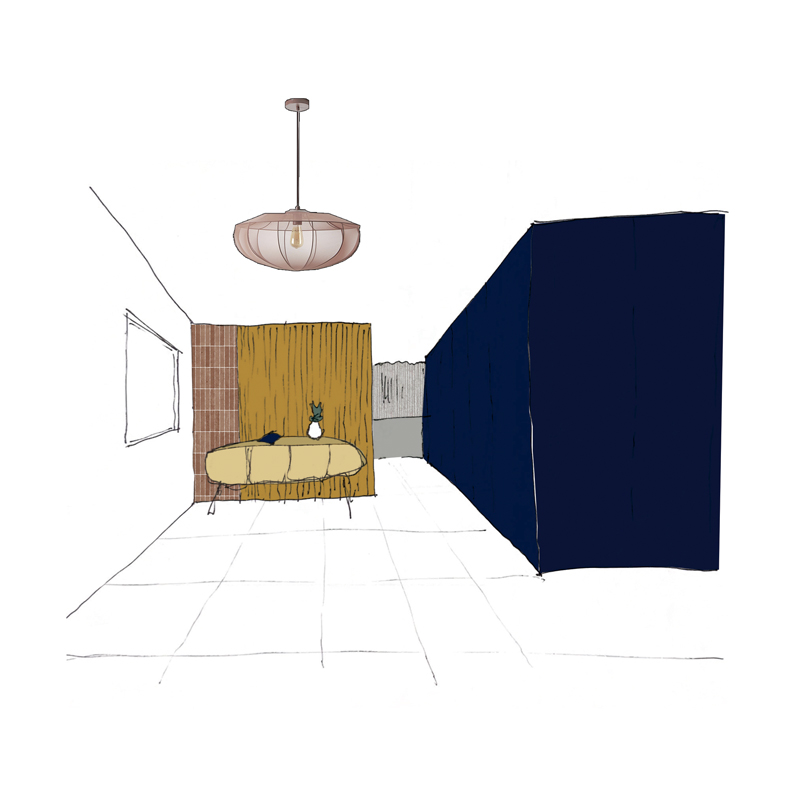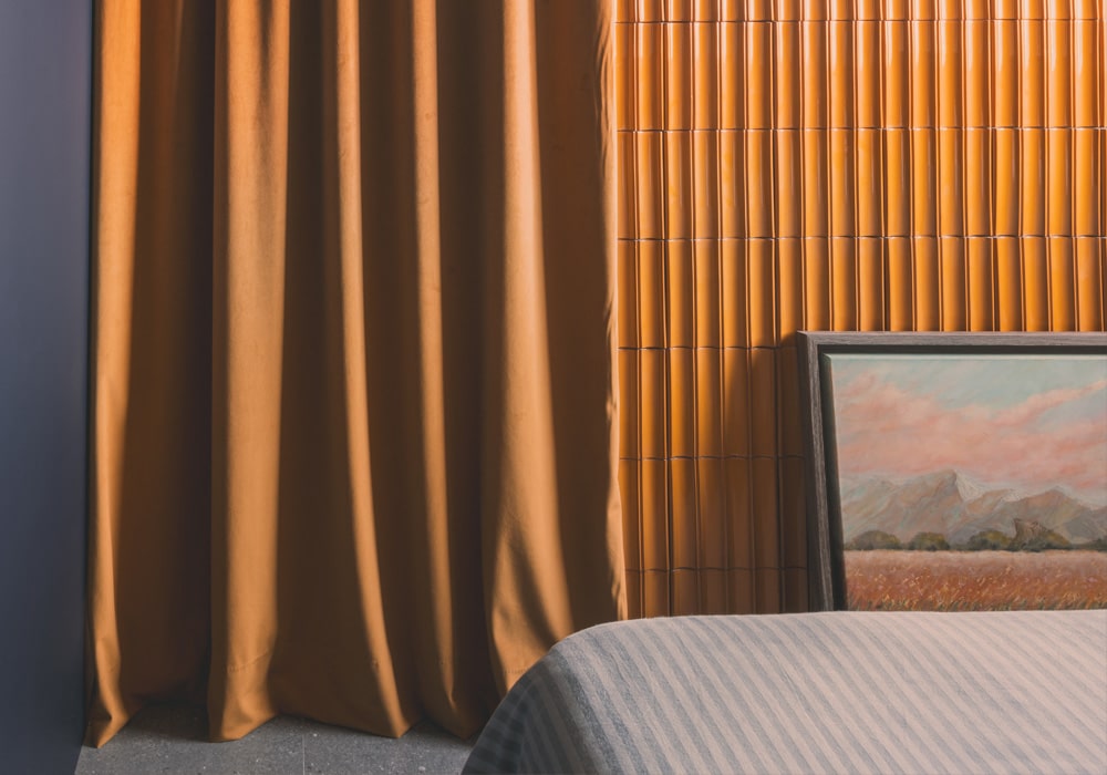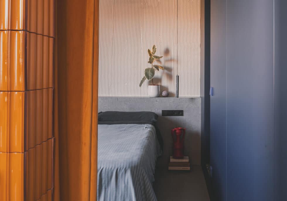 La cortina de terciopelo dorado que separa el salón del dormitorio da continuidad con sus pliegues a las ondas del alicatado de piezas amarillas que cubren el muro junto a ella. Justo enfrente se apoya un aparador con puertas color aceite. La lámpara arcilla dialoga con el armario color tierra, la lámpara amarilla con la encimera de la cocina azul celeste,…
