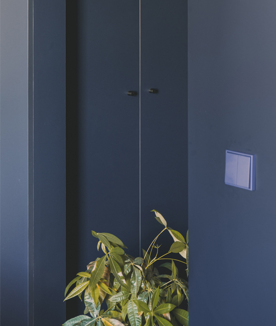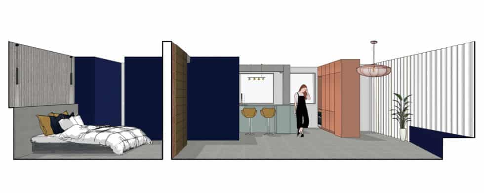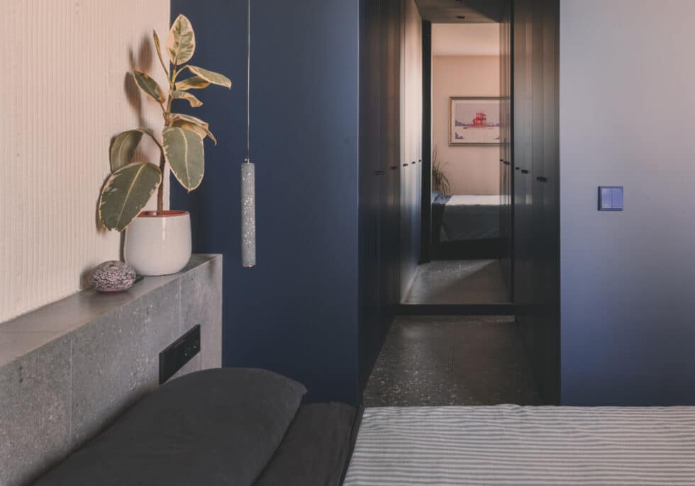 El tapizado azul del sofá habla con la textura ondulada metálica del muro frente a él, que se apoya sobre el mueble triangular nuevamente azul frente al sofá.