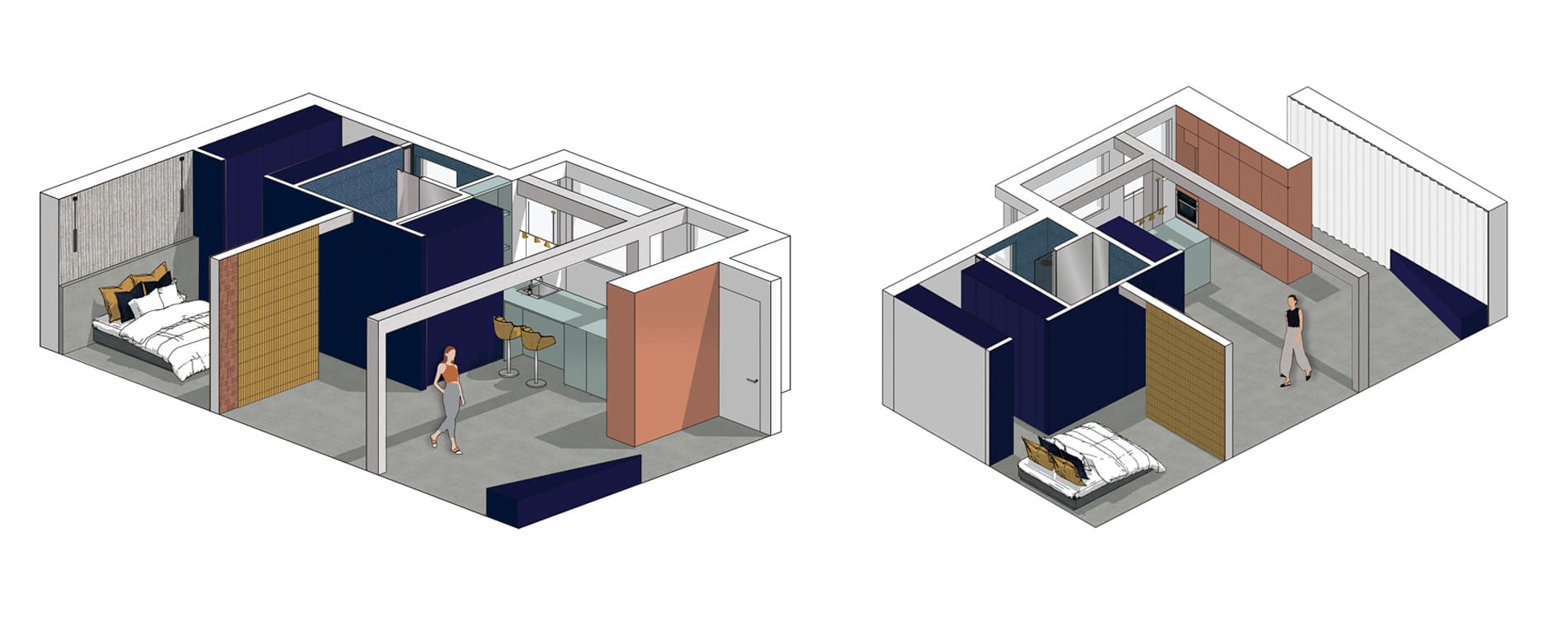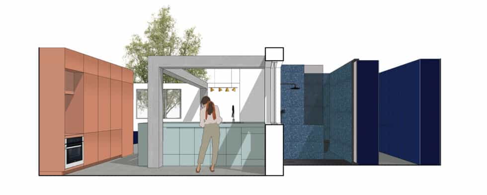 Los arquitectos plantearon una original distribución basada en la disposición estratégica de varias piezas puras, cada una de ellas recubierta de colores, materiales y texturas muy estudiados. Combinándose consiguen una organización espacial fluida, flexible y funcional.