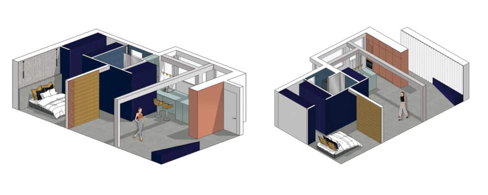En éste apartamento de 71 m2 vivían 9 personas. Una quinta planta, sin ascensor. En aquel momento se necesitaban muchas habitaciones, por eso aprovechando que la vivienda se abre a dos fachadas paralelas, desde un estrecho pasillo central brotaban minúsculos dormitorios donde apenas cabía una cama con algo de espacio extra para almacenar las pocas pertenencias personales de cada uno.