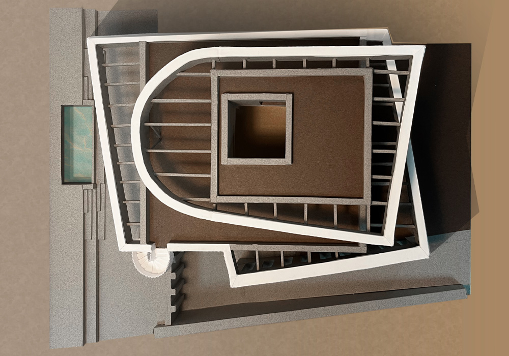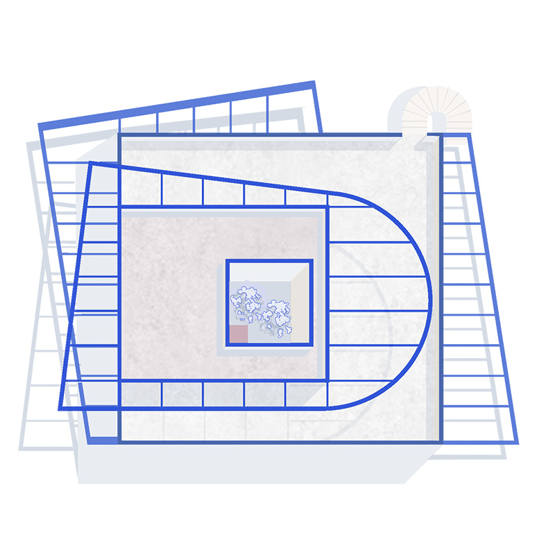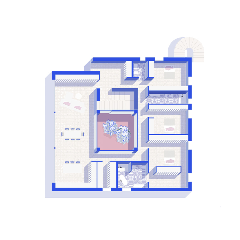 A pesar de lo que pueda parecer por su aspecto exterior, formalmente rico y expresivo, el programa de la vivienda en realidad se resuelve en un par de sencillos volúmenes rectangulares apilados uno sobre otro, organizados en torno a un patio central que llena de luz y ventilación natural el corazón de la casa.
