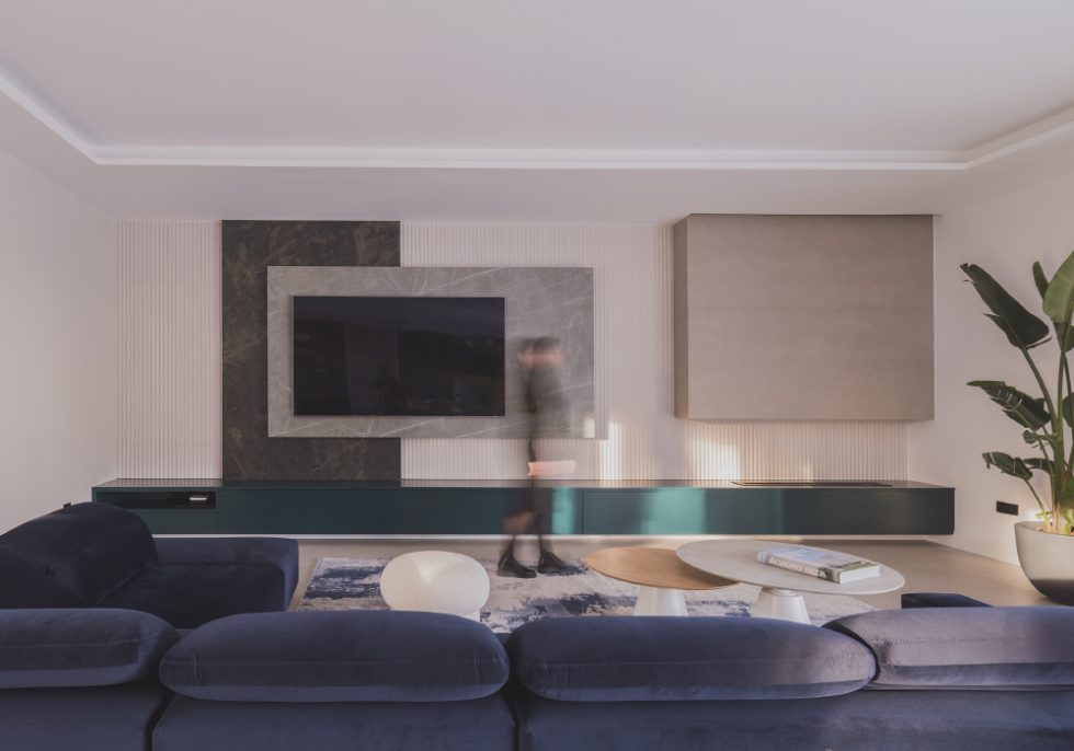 Se diseñó un collage geométrico como frente para el salón con un mueble bajo color verde oscuro subrayando la importancia de este muro, donde está la tele y una chimenea. Distintas piezas pétreas y cerámicas completan el collage.