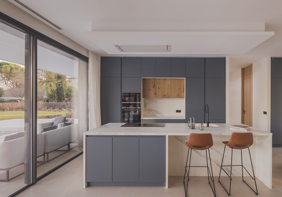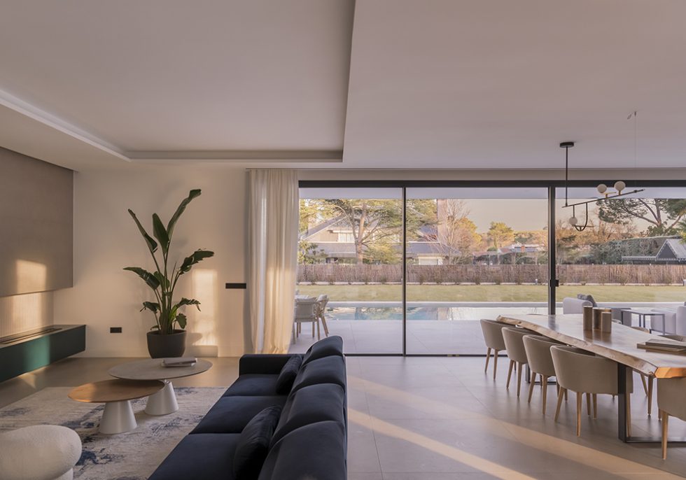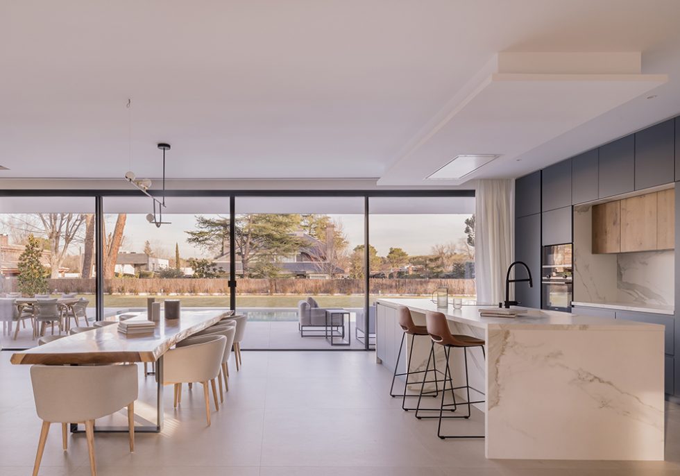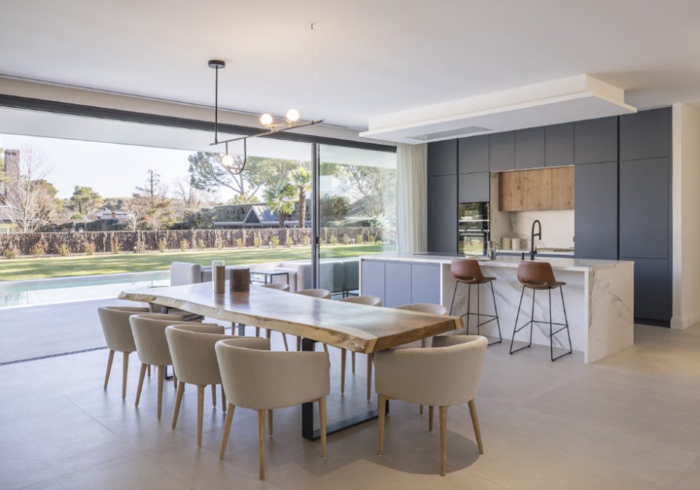 Enseguida descubres el espacio principal de la vivienda, abierto completamente al porche y al jardín de la casa, el salón-comedor-cocina, donde también hay hasta una zona de lectura y biblioteca. Un espacio pensado para que la familia pueda estar siempre unida, cómoda y los peques jugando a la vista.