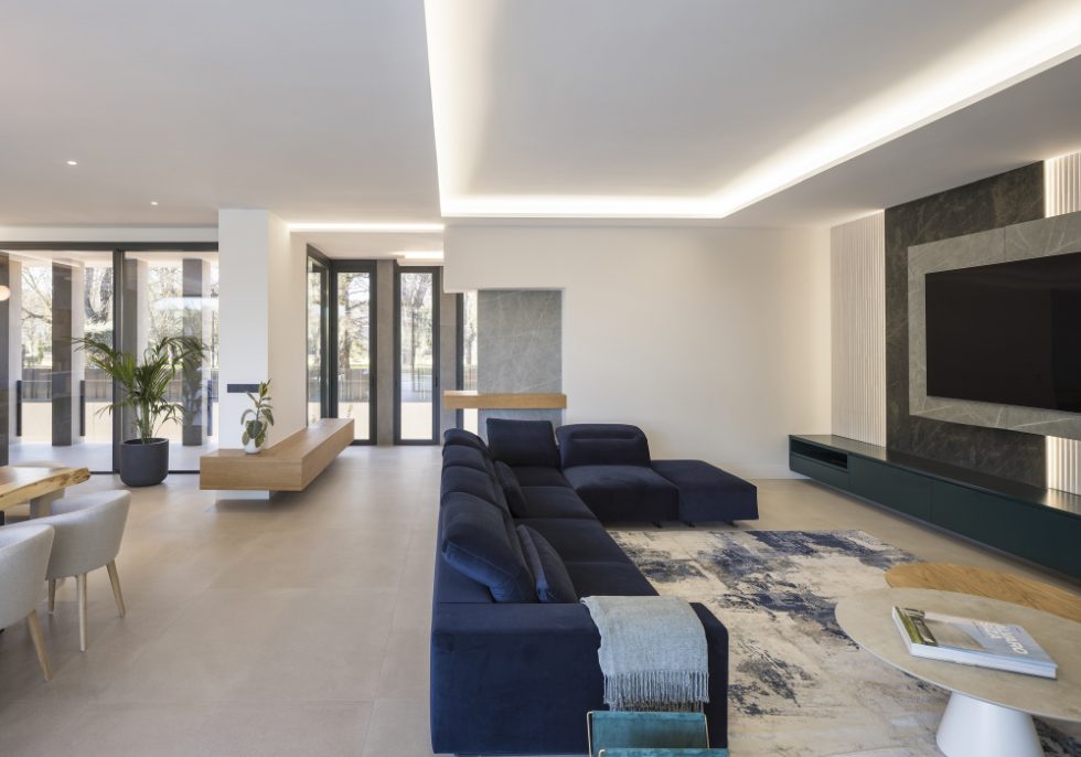 Subiendo unos pocos escalones flotantes te colocas en el eje del espacio que genera la columnata con la casa, y ese es el acceso. Nada más abrir la puerta entras en un recibidor lleno de luz natural tamizada donde puedes ver los que serán los materiales que te acompañarán ya durante todo el interior: maderas en tonos dorados claros, grises, materiales pétreos y porcelánicos de gran calidad y belleza.