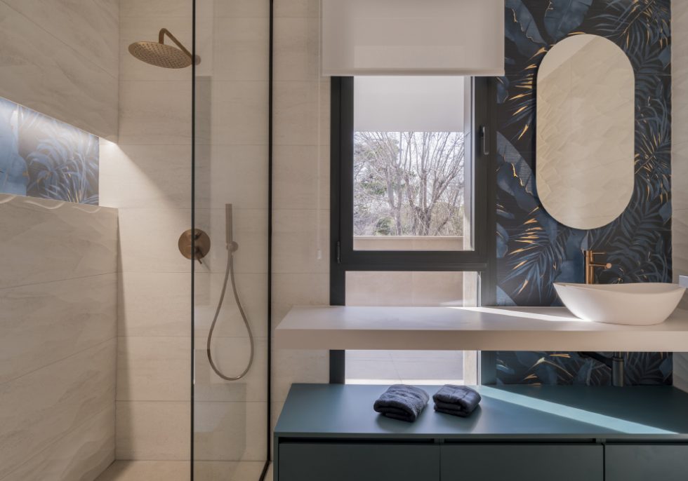 Los baños de la casa son todos distintos. Cada uno es un collage cerámico diferente, adaptándose al espacio y a la luz. Los diseñadores de OOIIO buscaron la mejor combinación para espejos, iluminación artificial, mobiliario, sanitarios,… consiguiendo una variedad de soluciones muy atractiva.