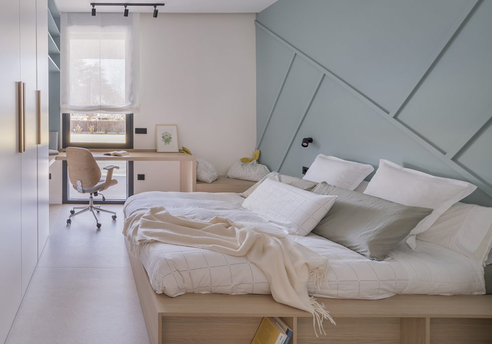 En las habitaciones de los niños se diseñaron armarios a medida con escritorios y zona de almacenaje. Las camas y los cabeceros siguen el mismo juego el resto del mobiliario.