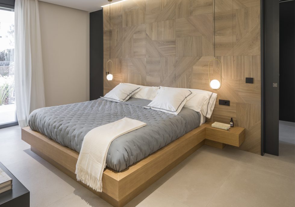 Para la habitación principal los interioristas utilizaron colores más serios que en los otros dormitorios, más oscuros, sin perder luminosidad y conexión con el resto de la casa. El vestidor, diseñado a medida, se comunica o asila de la zona de la cama con unas puertas correderas embutidas en el cabecero, dando la opción a que uno de los miembros de la pareja se levante y se vista sin molestar al otro.