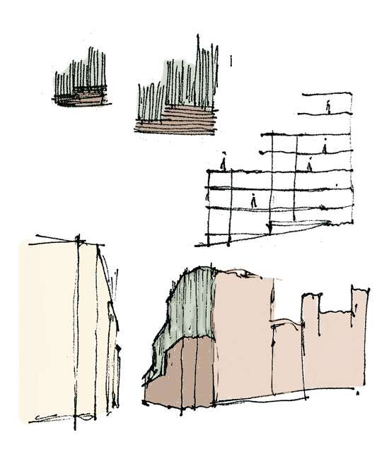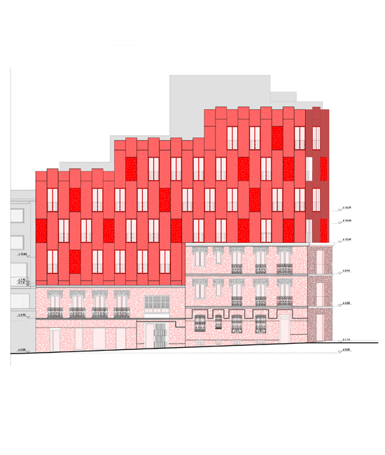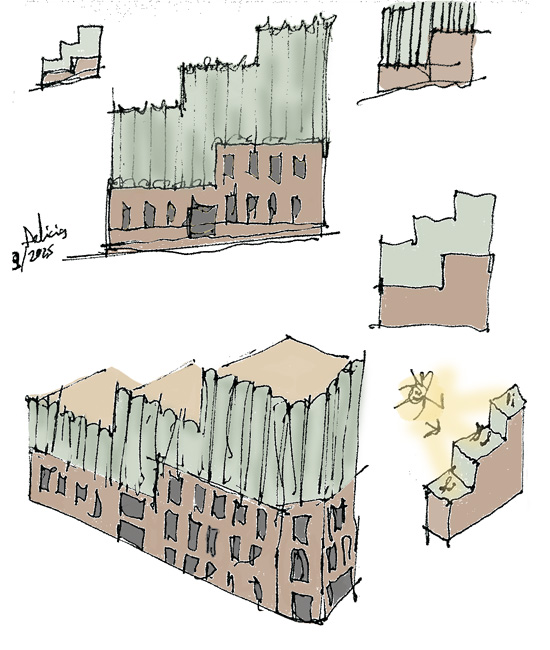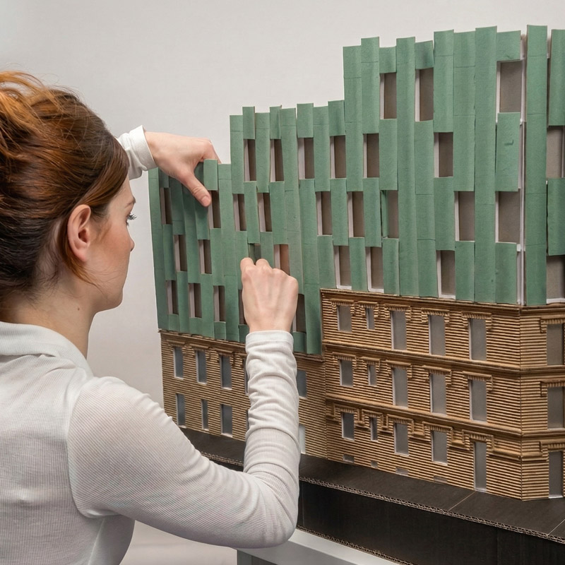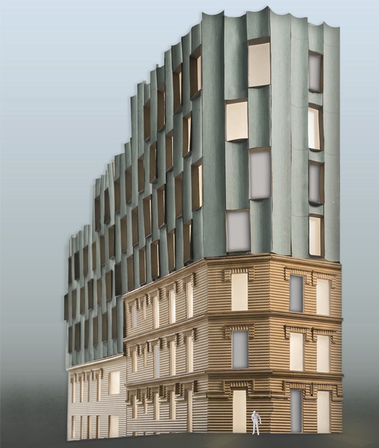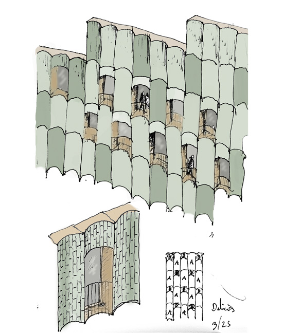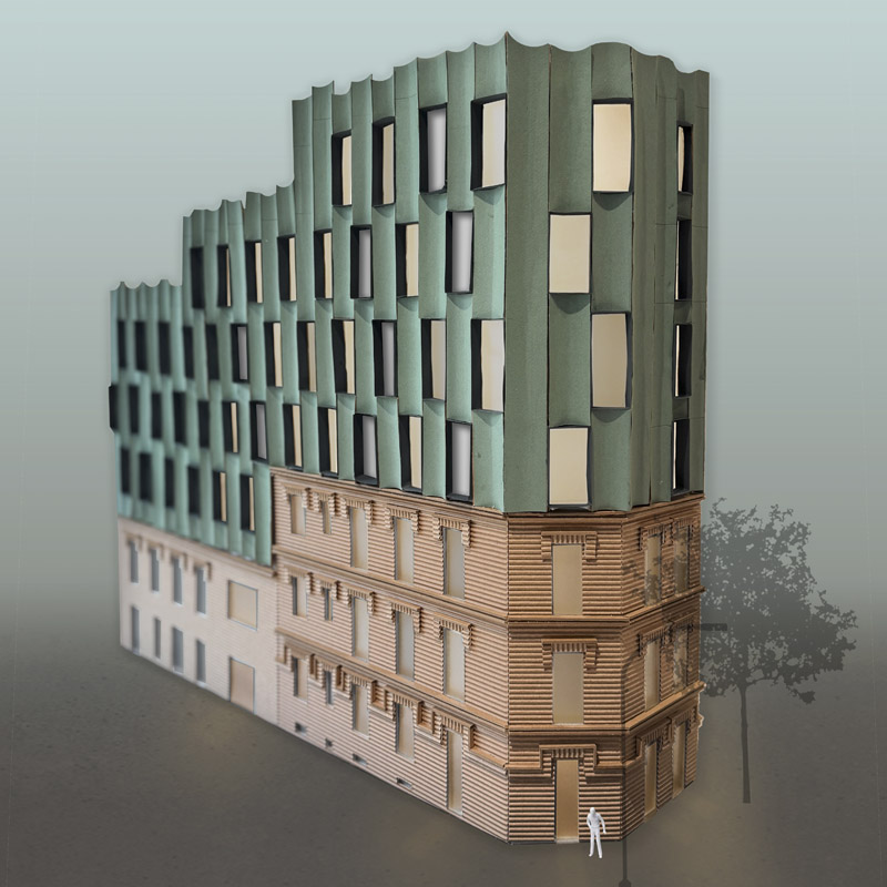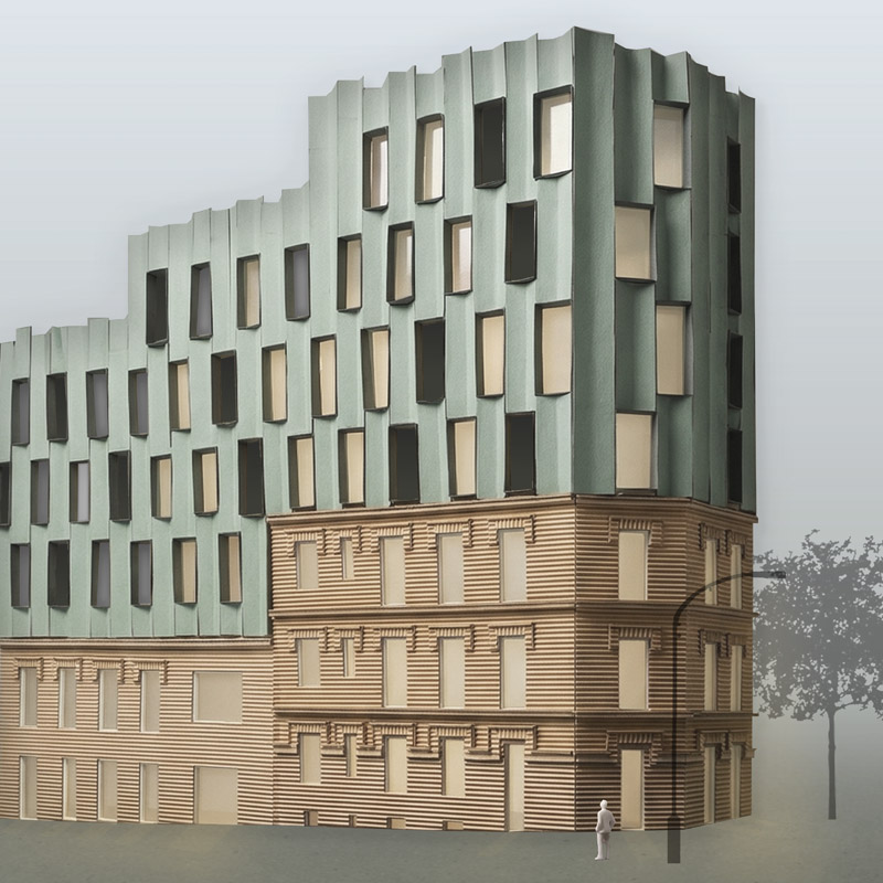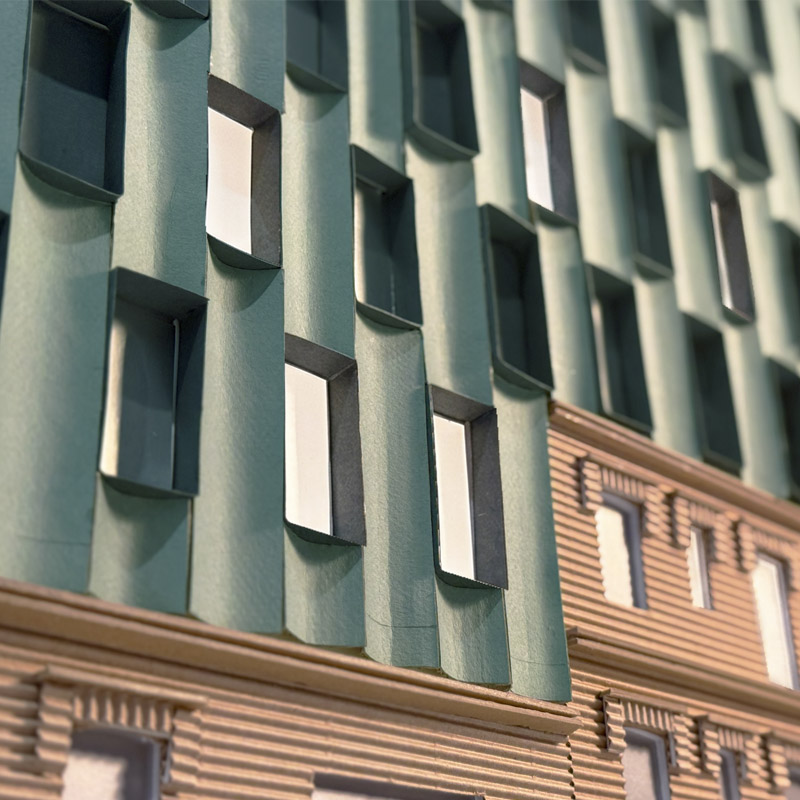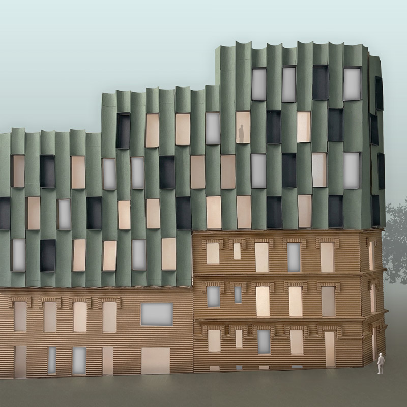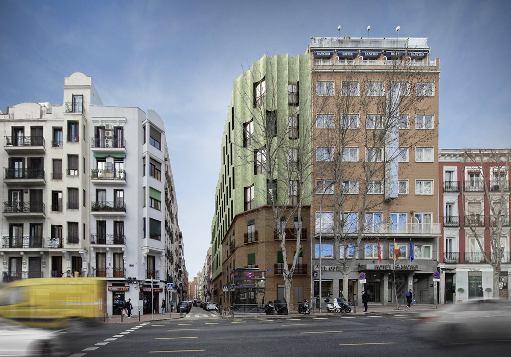 Los arquitectos intencionadamente dan un aspecto sofisticado y singular a las nuevas plantas construidas sobre el antiguo edificio del siglo pasado, para destacar por contraste con la bonita fachada neomudejar de ladrillo rojizo. Utilizan unos paneles prefabricados cóncavos recubiertos de piezas cerámicas verde brillante, dando continuidad matérica (ladrillo-cerámica) pero contraste cromático (rojo-verde) y de textura (áspero-pulido). Las piezas de fachada se traerán de fábrica ya listas para colgarse de la estructura del edificio, reduciendo así mucho los tiempos de obra y el consumo de CO2 del proceso.