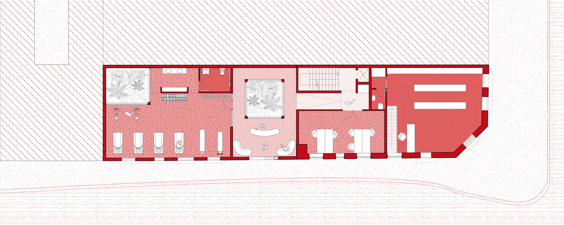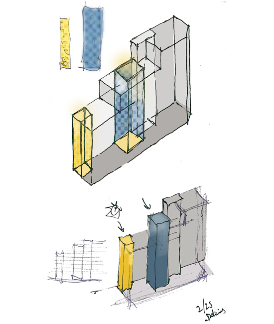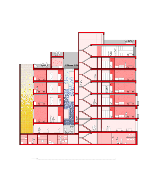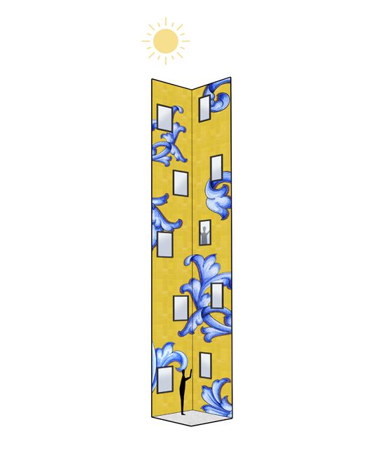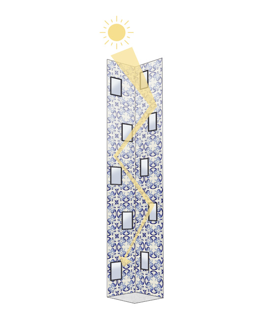 Los dos patios se cubrirán con mosaicos cerámicos, jugando con los colores, haciendo rebotar la luz mientras baja por ellos gracias a su acabado brillante, consiguiendo así un aspecto mágico y sugerente justo en esos espacios interiores que parece que siempre tienen que ser “de segunda” sin abrirse a las calles.