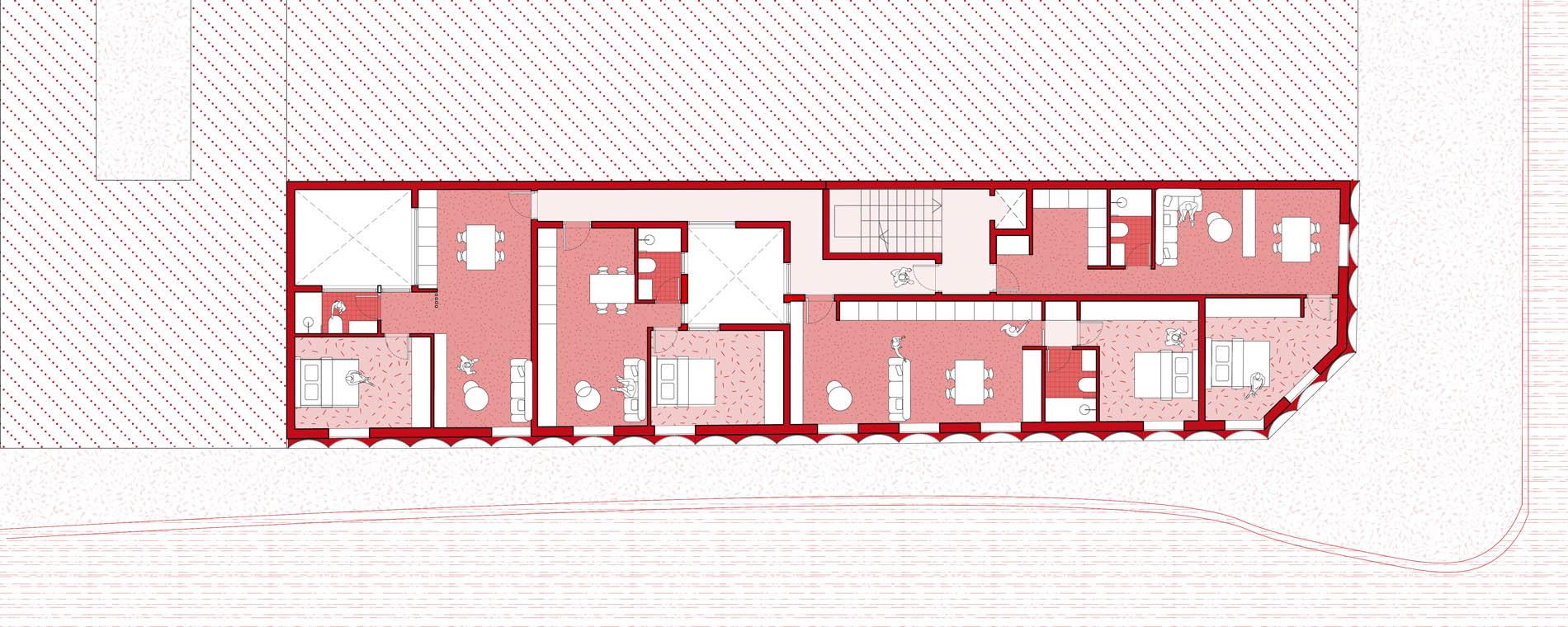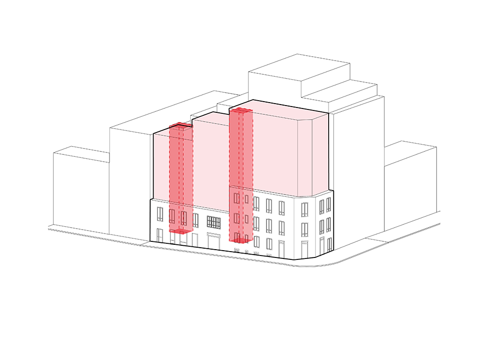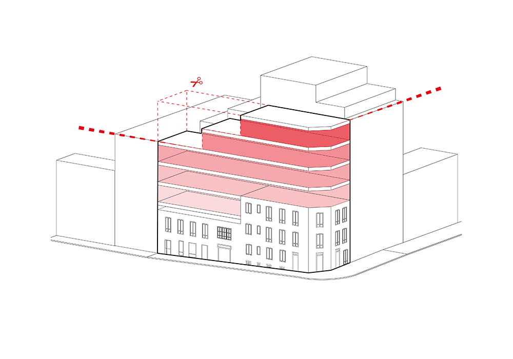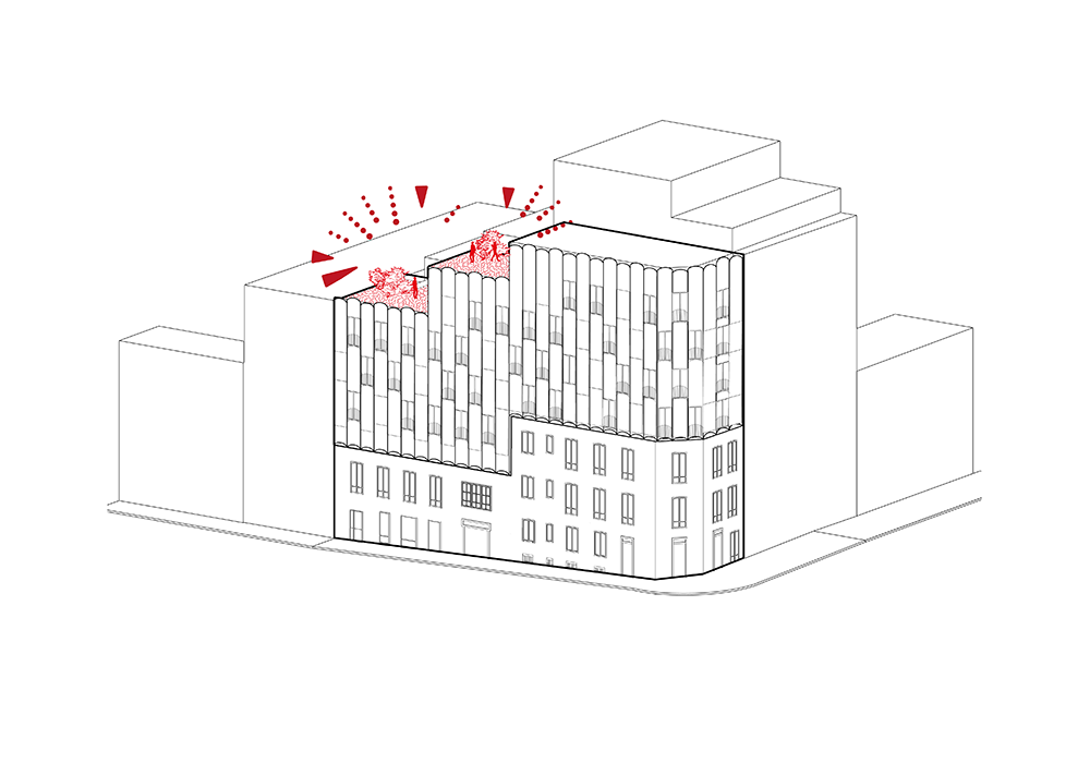 La distribución interna de los apartamentos es funcional y muy bien aprovechada. La forma rectangular estrecha de la parcela y los dos nuevos patios hacen que todas las viviendas gocen de buena iluminación y ventilación natural. Las tres últimas plantas se aterrazan para cumplir con los requerimientos de altura de la normativa, creando así unos estupendos espacios abiertos en cubierta, que sin duda aportan un gran valor añadido a las casas Premium de la parte superior.