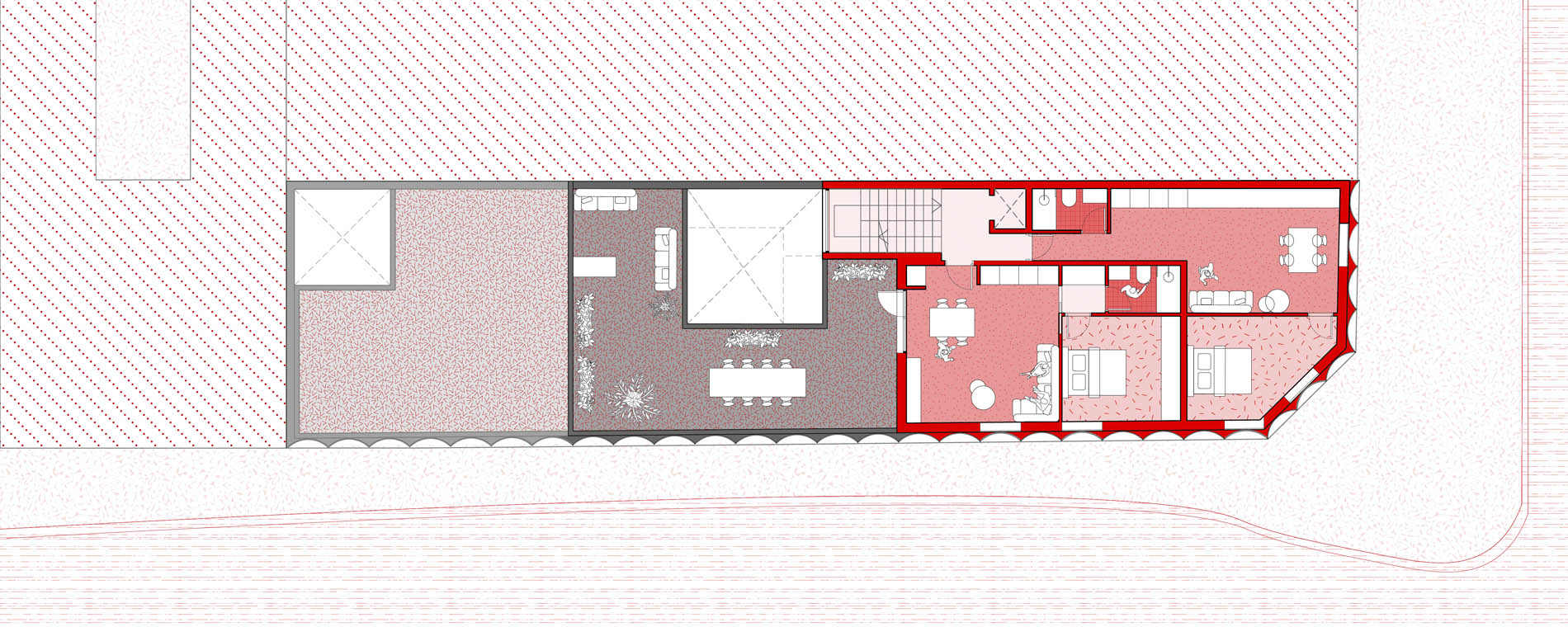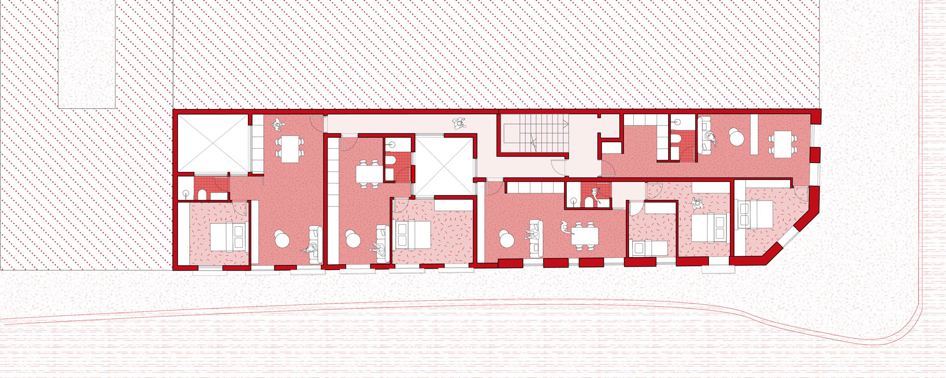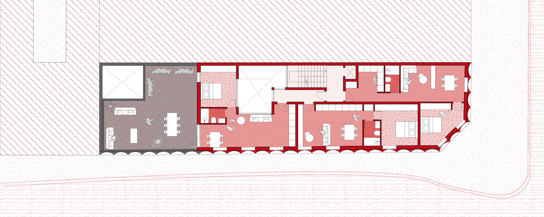 La distribución interna de los apartamentos es funcional y muy bien aprovechada. La forma rectangular estrecha de la parcela y los dos nuevos patios hacen que todas las viviendas gocen de buena iluminación y ventilación natural. Las tres últimas plantas se aterrazan para cumplir con los requerimientos de altura de la normativa, creando así unos estupendos espacios abiertos en cubierta, que sin duda aportan un gran valor añadido a las casas Premium de la parte superior.